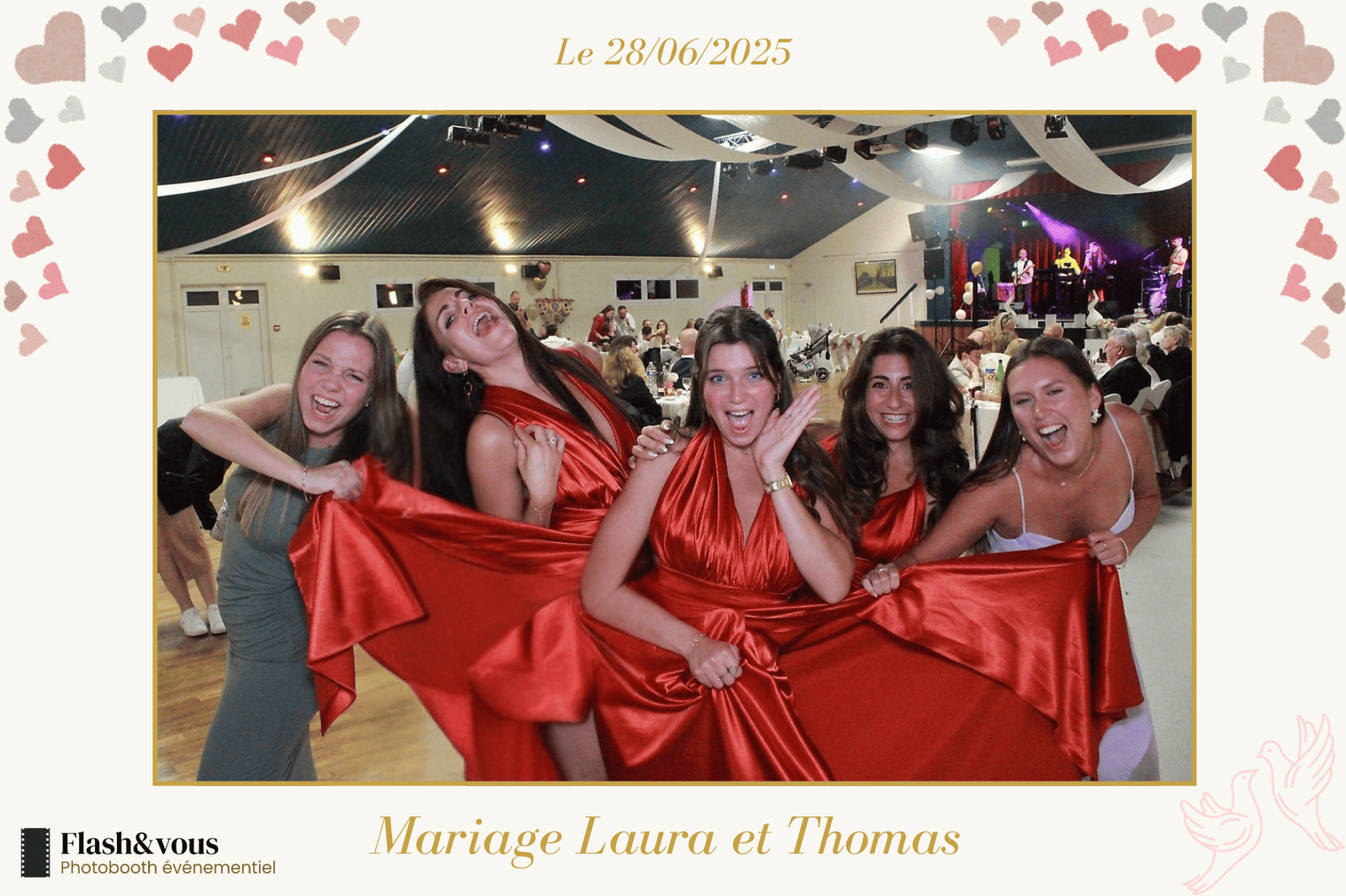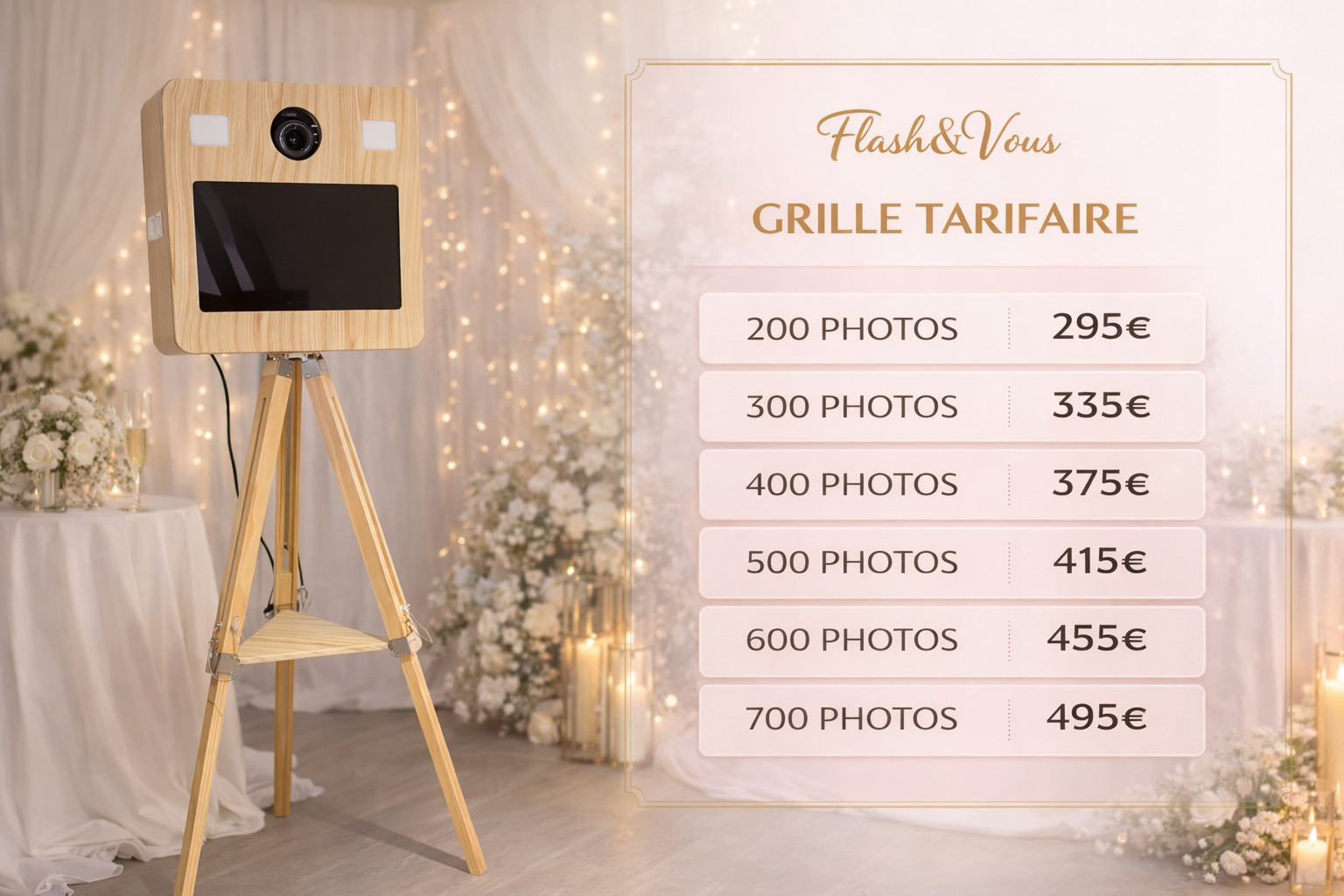 Offrez à votre mariage une animation inoubliable grâce à la location de photobooth Flash & Vous. Capturez les sourires, les fous rires et les moments forts de votre journée avec des photos personnalisées à votre image. Un souvenir unique pour vous et vos invités, à conserver pour toujours.